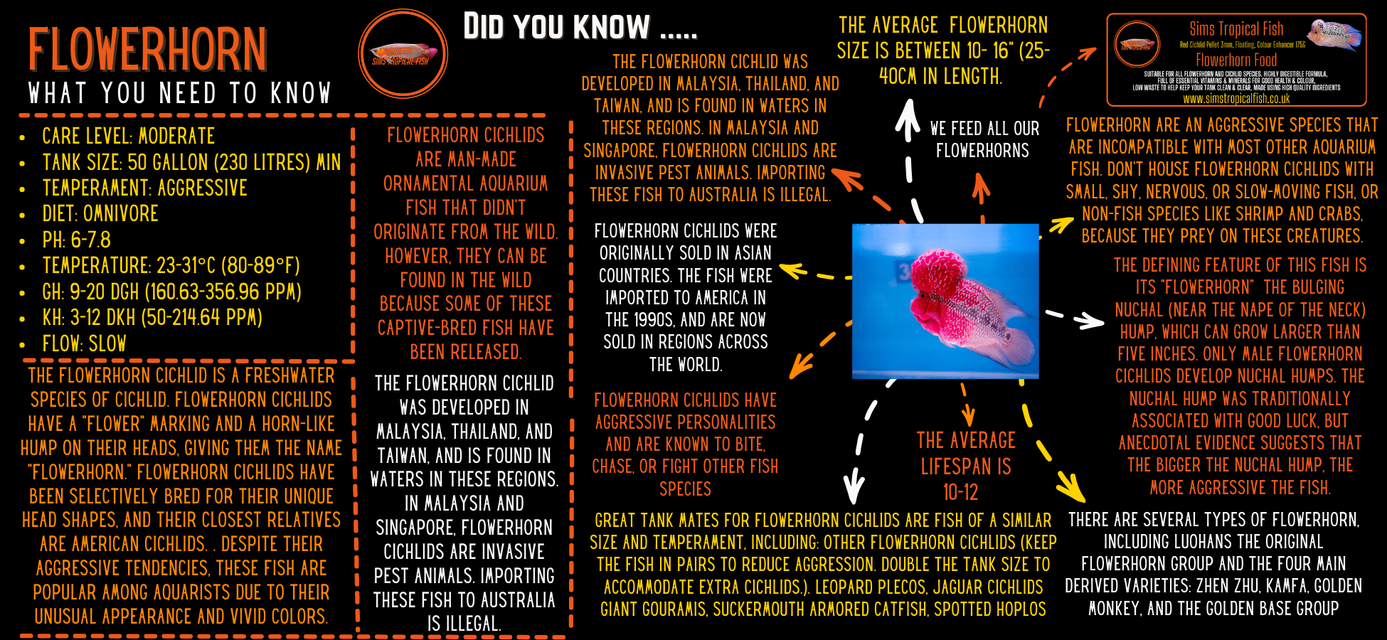 Flowerhorns are generally best kept alone due to their aggressive and territorial nature. If kept with others, only very robust tank mates may be considered in a spacious aquarium: