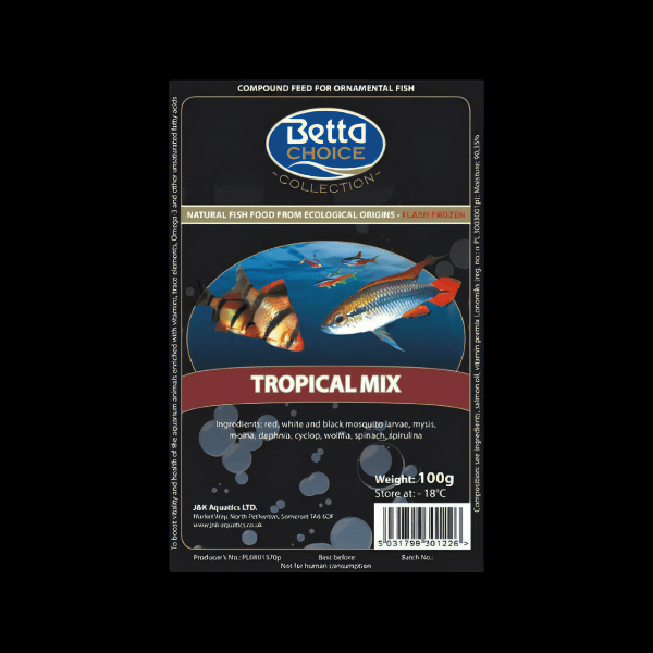 Betta Choice frozen Tropical Mix is a mix of healthy ingredients to provide for an interesting and varied diet. This blister pack (of 30 cubes) contains Bloodworms, Glassworms, Blackworms, Mysis, Moina, Daphnia, Cyclops, Wolffia, Spinach, and Spirulina, all mixed into each cube. These are enriched with vitamins, trace elements, Omega-3 and other unsaturated fatty acids and will boost the vitality and health of all tropical fish. Suitable for feeding to most species of tropical community fish, small cichlids, bottom feeders, and some amphibians. Available in 100g blister packs.