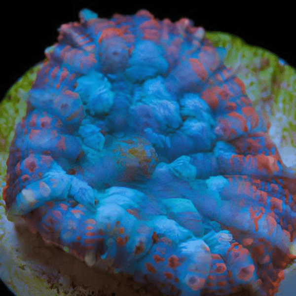 Mushroom Corals from the Rhodactis genus are known for their unique, textured appearance and brilliant colors, ranging from shades of green, blue, and purple to more exotic blends. They are soft corals that can grow into large, fleshy colonies, adding a lush, organic look to your reef tank. Easy to care for and fast-growing, these corals are ideal for filling in spaces within your reefscape.