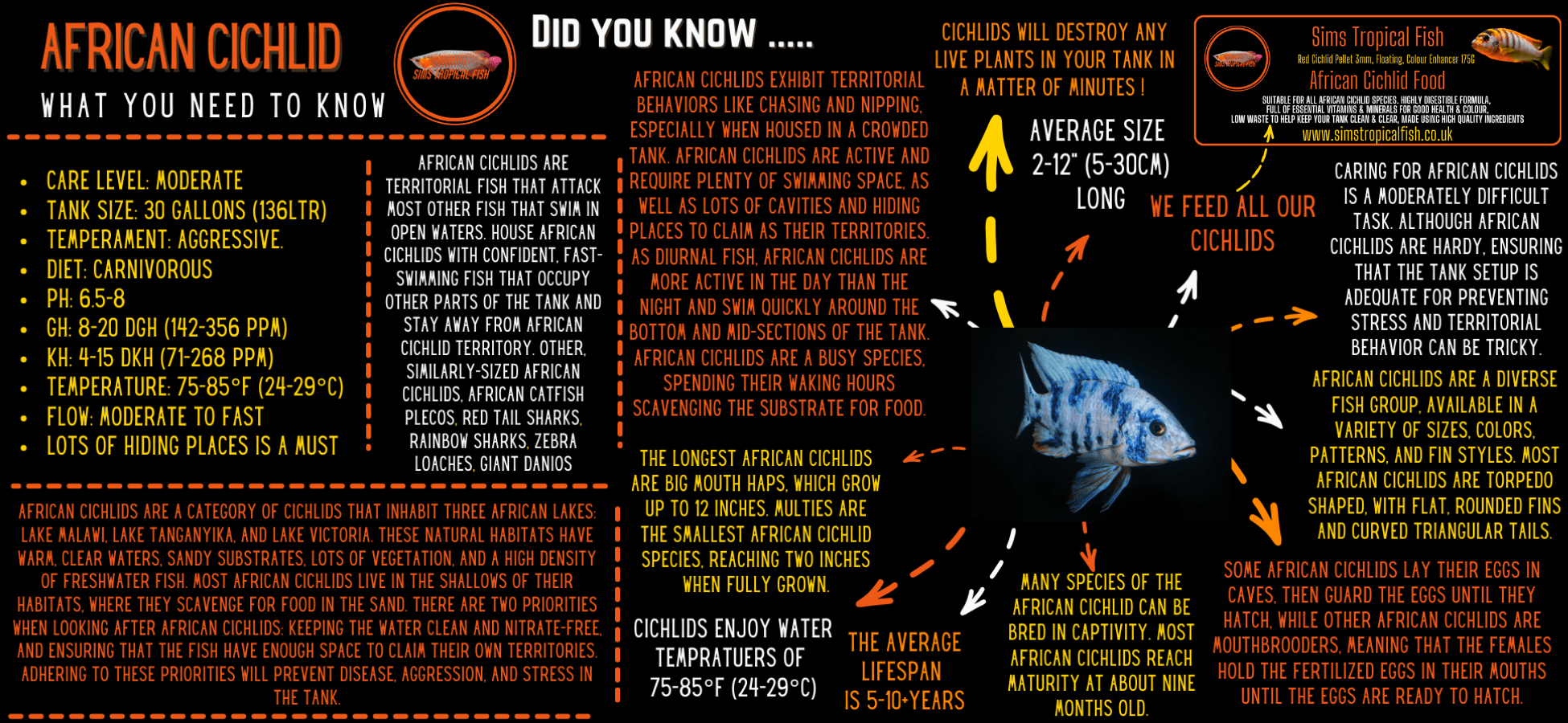 Frontosa are Omnivorous – Does well with flake or pellet food. Can be fed freeze-dried or frozen krill or plankton as a treat.