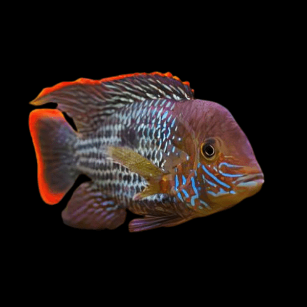 The Green Terror Cichlid, scientifically known as Andinoacara Rivulatus, is a captivating freshwater fish that adds a splash of vibrant color and dynamic behavior to any aquarium. Renowned for its striking appearance, the Green Terror boasts an electric blue body with a brilliant orange trim, especially noticeable in mature males. This species can reach up to 8 inches in length, making it a prominent feature in home aquariums.