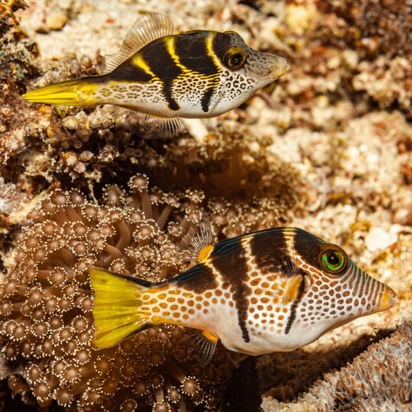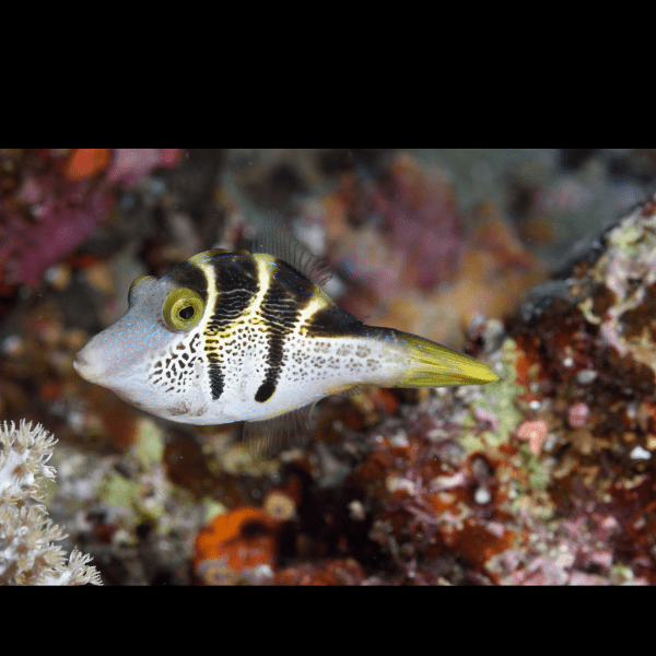 Origin: The Mimic Valentini File Fish is found in the warm waters of the Indo-Pacific region, particularly around Southeast Asia, the Philippines, and northern Australia. They typically inhabit coral reefs and lagoons at depths ranging from 1 to 30 meters, where they seek shelter among coral and rocky outcroppings.