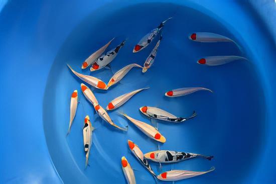 The first Tancho variety was the Tancho Kohaku and was produced by breeding 2 Kohaku koi together. This pairing produced a wide range of Kohaku fry with varying amounts of hi. Many of these would have been rejected and only the nicest ones keep on for growing and further breeding. At this point, no breeders were actively looking for a Tancho Kohaku, but it is said that one breeder came across a Kohaku fry with no hi on its body and the perfect spot of hi on its head.